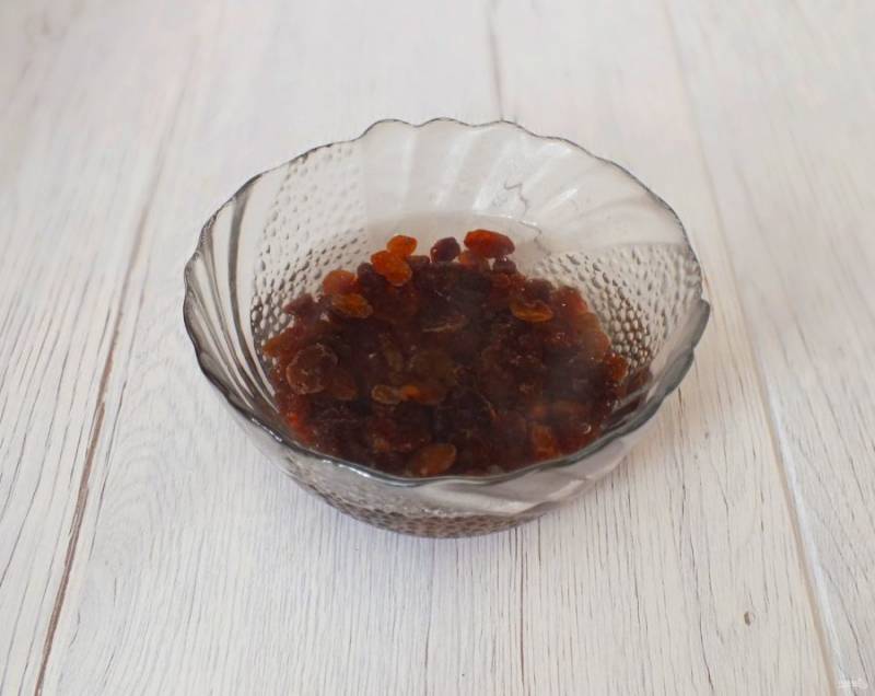 Изюм промойте, залейте кипятком и оставьте на 15-20 минут.