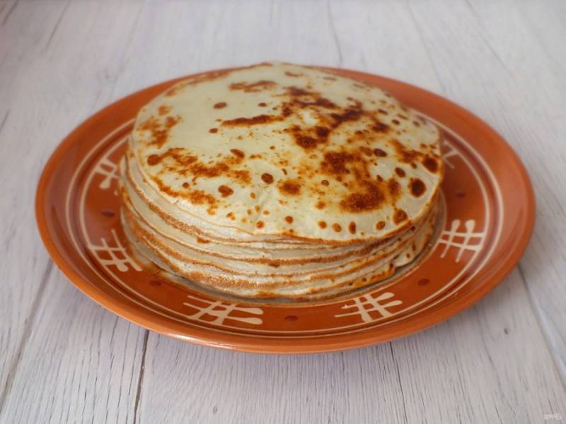 Если необходимо сковороду смажьте тонким слоем растительного масла и обжарьте тонкие блинчики с двух сторон до румяного цвета.
