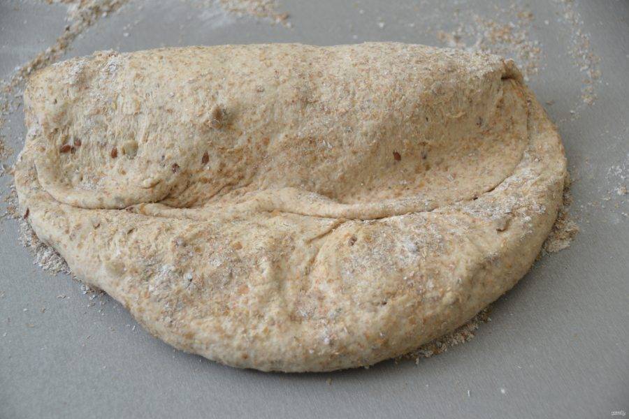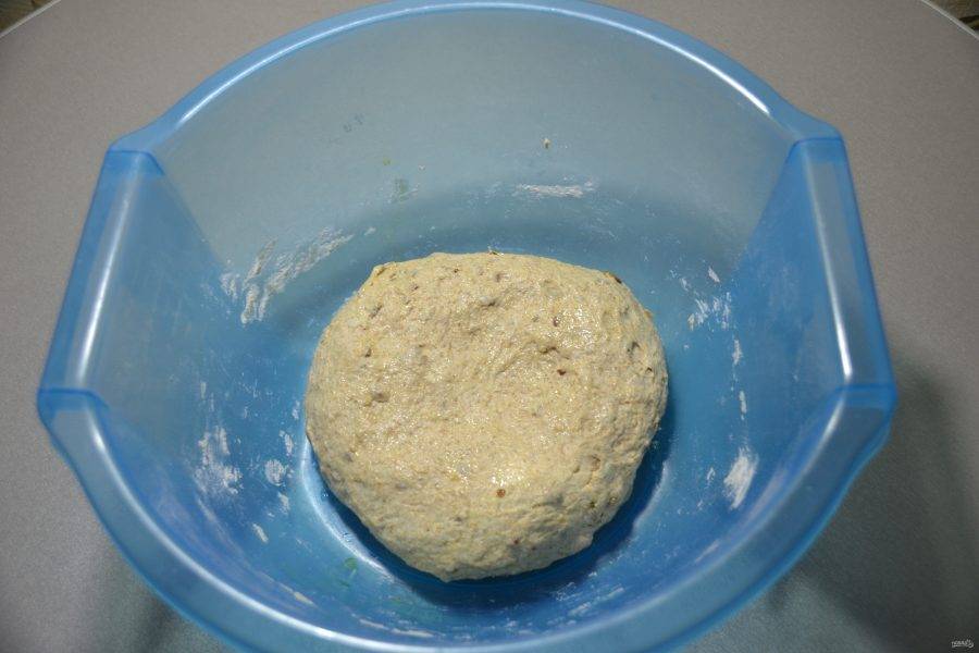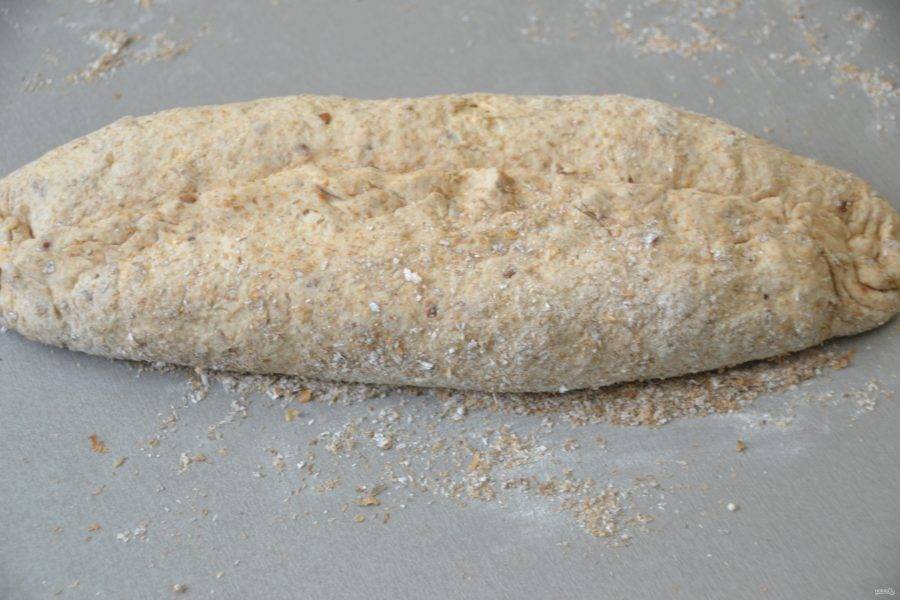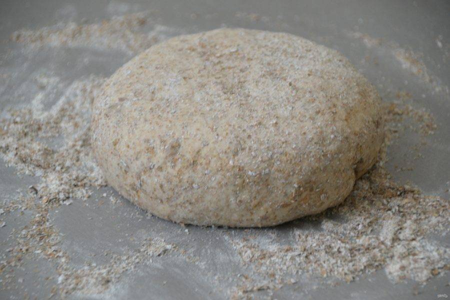 Выбродившее тесто выложите на рабочую поверхность стола, присыпанную смесью муки и отрубей, подкатайте в шар и дайте предварительную расстойку 30 минут, чтобы тесто согрелось и дрожжи "проснулись".