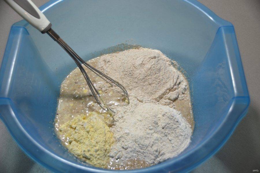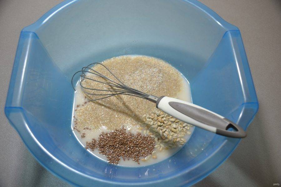 В воду комнатной температуры добавьте закваску, прессованные дрожжи, соль, сахар, семена льна, подсолнечника, ржаную крупку. Размешайте до растворения дрожжей, соли и сахара.