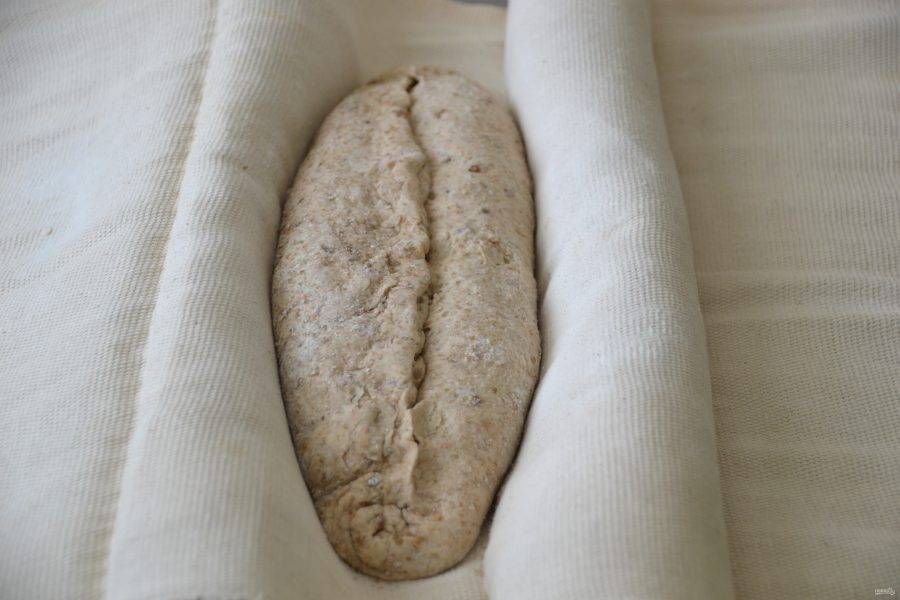 Уложите на расстойку швом вверх, с боков подложите валики из салфеток, чтобы они удерживали тесто, как в формочке. Дайте расстойку 1 час .