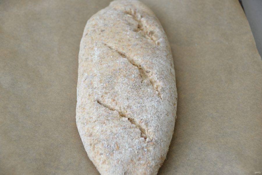 Через час переложите заготовку на лист для выпечки, острым ножом сделайте надрезы. Выпекайте первые 10 минут с паром при максимальной температуре, далее понизьте температуру до 180-200 градусов, выпустите лишний жар и выпекайте еще 50 минут.