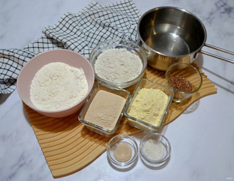 Подготовьте ингредиенты в соответствии со списком к рецепту. Мука может быть разная, но при этом необходимо соблюсти пропорциональное соотношение сухих ингредиентов и воды. Замес теста необходимо сделать за 10-12 часов до выпечки. Лучше всего вечером.