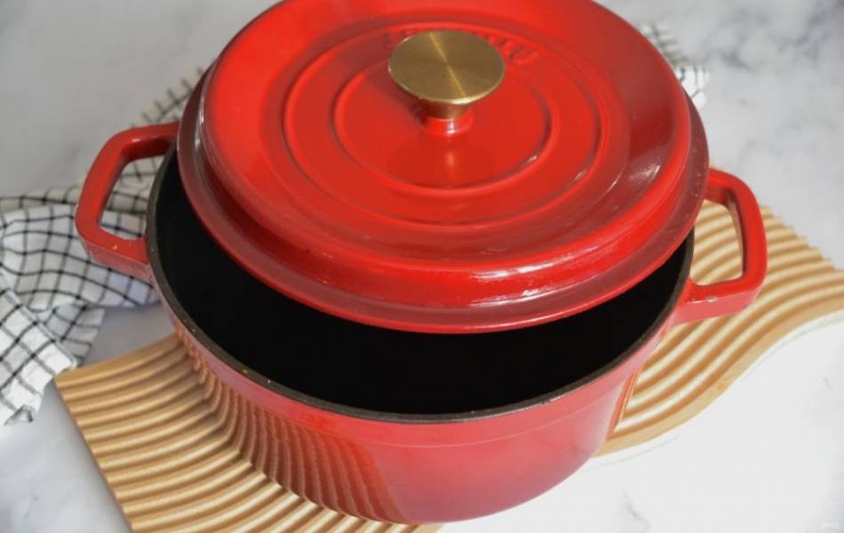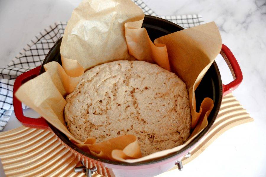 Достаньте прогретую чугунную кастрюлю из духовки и держась за края пергамента аккуратно опустите хлеб в горячую кастрюлю.
