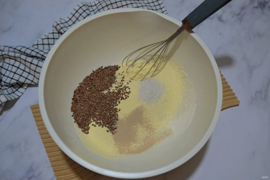 В миску для замешивания теста всыпьте все сухие ингредиенты, смешайте.