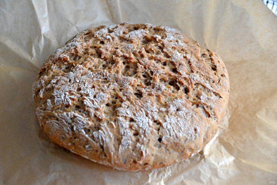 Через 55 минут достаньте хлеб из кастрюли за концы бумаги для выпечки.