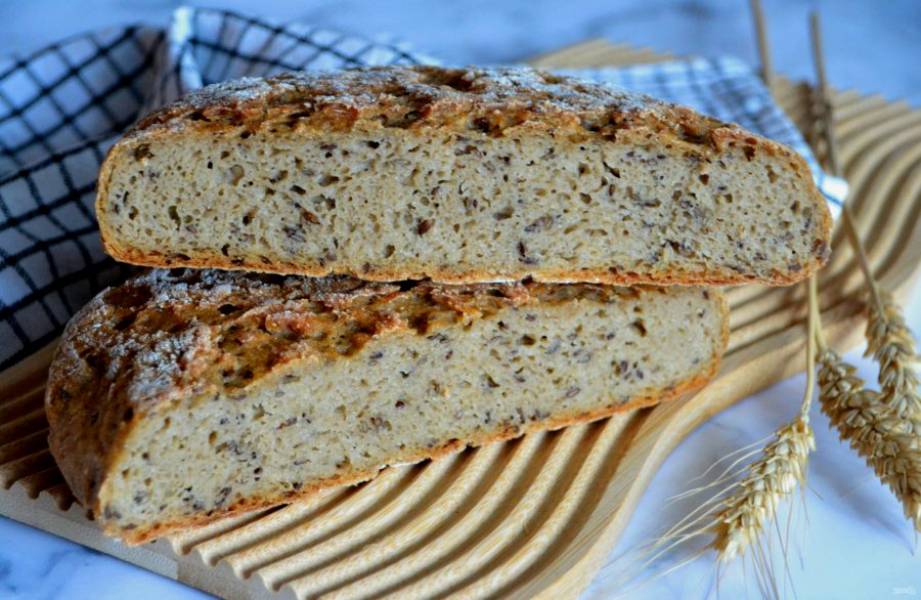 У хлеба очень красивый разрез, он пористый, с крапинками льняных семечек, ароматный и очень вкусный. К тому же такой хлеб очень полезный, ведь он приготовлен из пяти видов злаков.