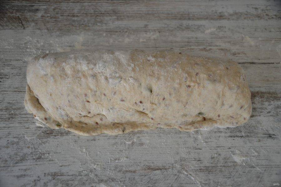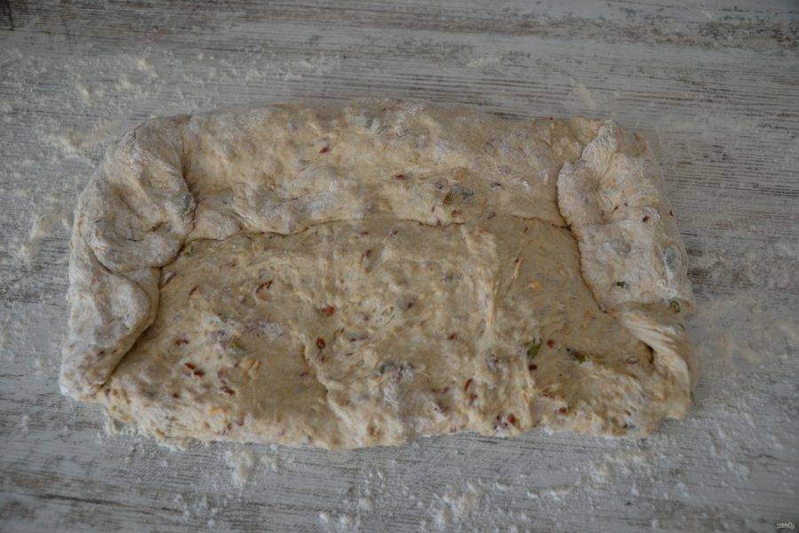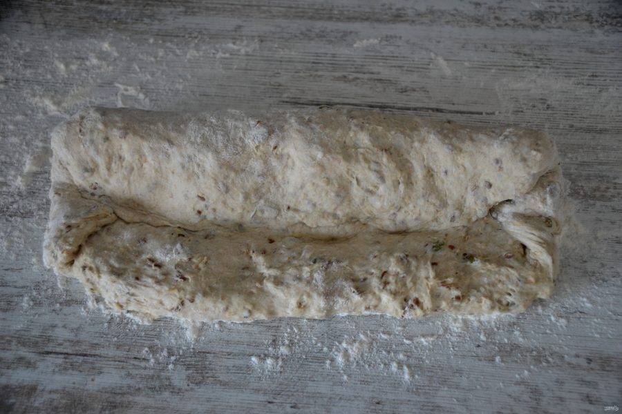 Сформуйте хлеб любой формы, например, в виде батона. Для этого подверните верхний край теста по направлению к себе, подверните бока, хорошо защипните.