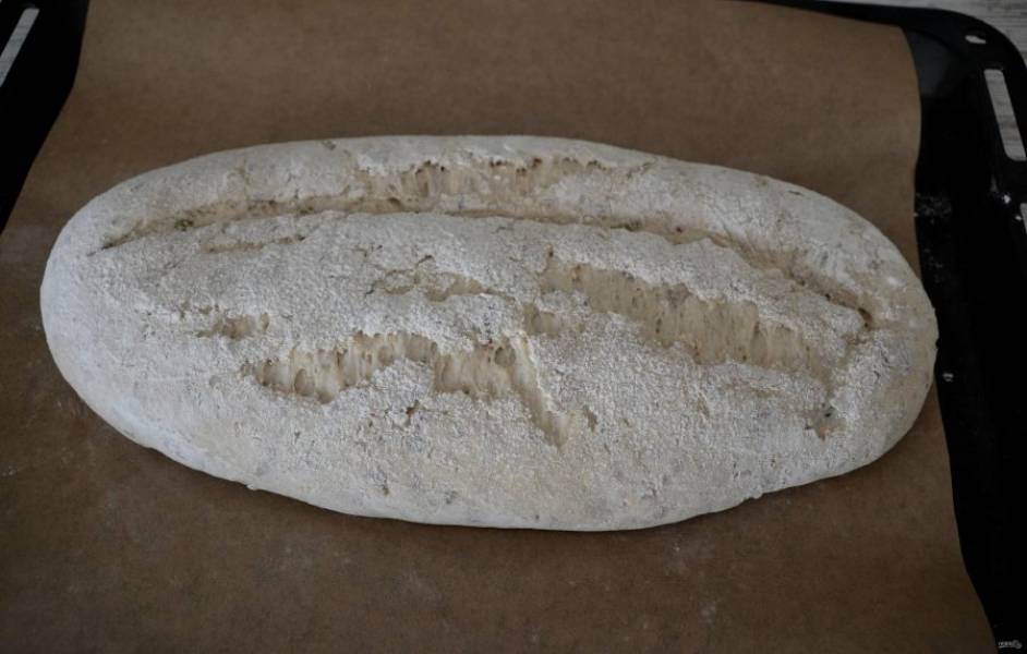 Разогрейте духовку в режиме "верх-низ" до 250 градусов. Перед выпечкой сделайте на хлебе надрез. Выпекайте 10 минут при температуре 250 градусов. Затем уменьшите температуру до 180 градусов и выпекайте до готовности еще 30 минут.