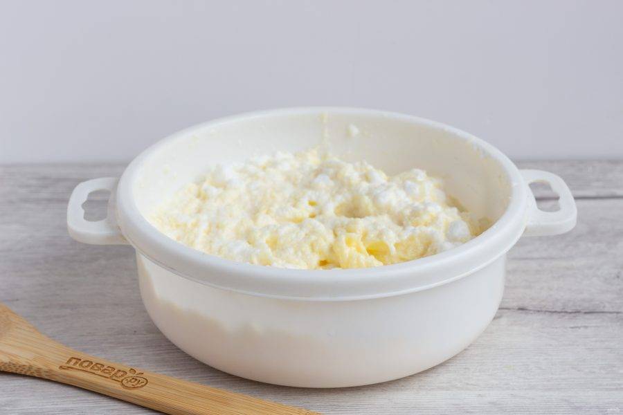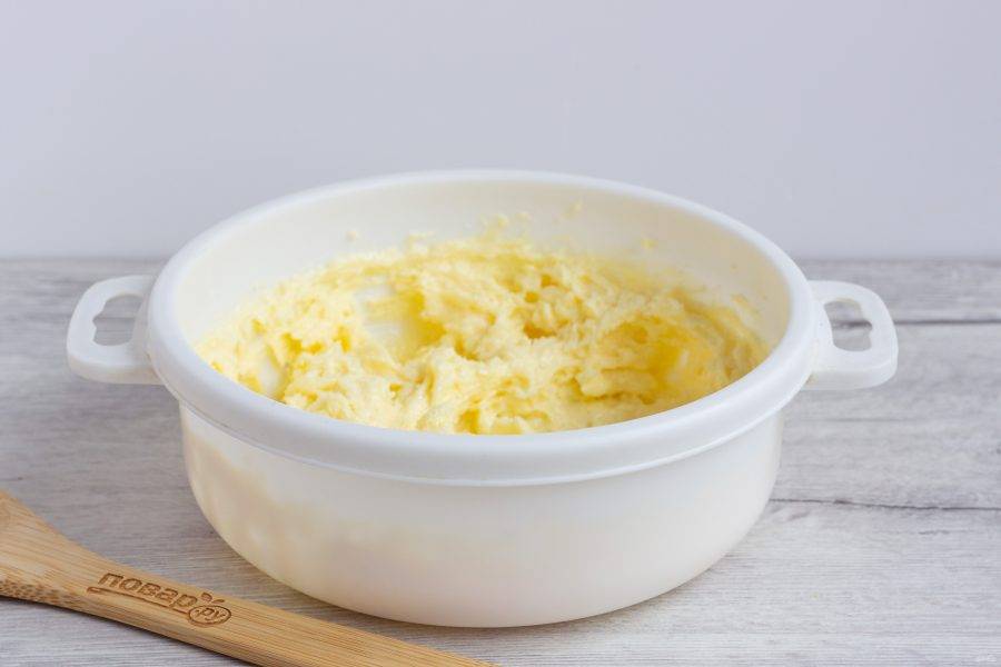 Остальной сахар взбейте с размягченным сливочным маслом, продолжая взбивать, добавьте желтки. Взбивайте до однородной массы.