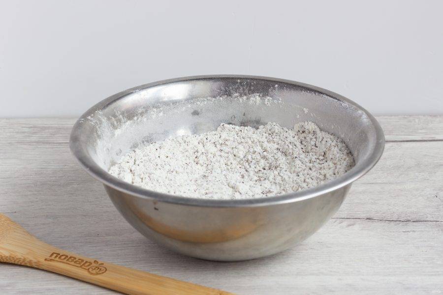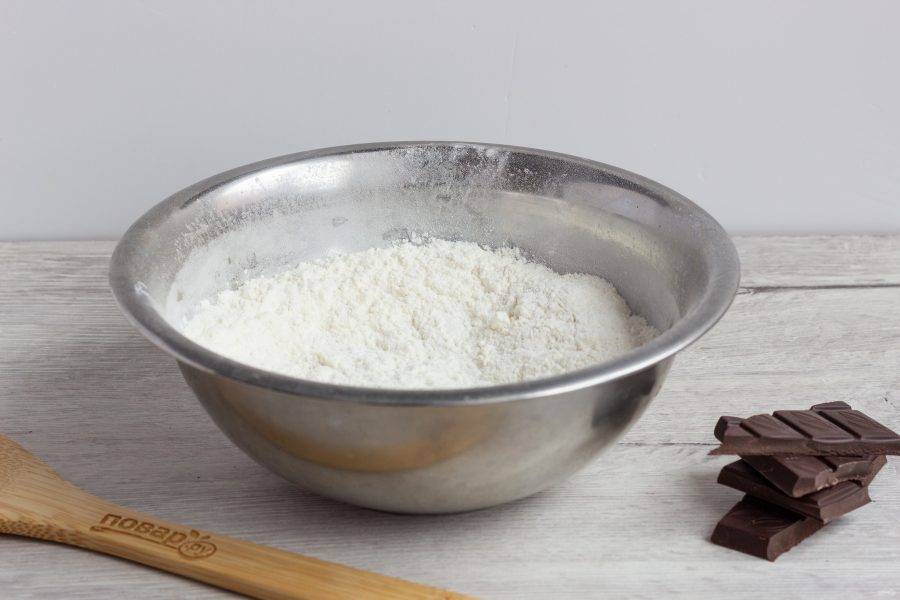 Муку просейте с крахмалом и разрыхлителем, добавьте ванилин. Перемешайте сухие ингредиенты.
