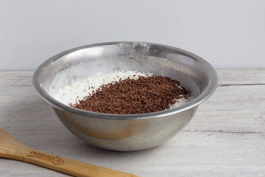 Шоколад разделите пополам. Одну половину натрите на мелкой терке.