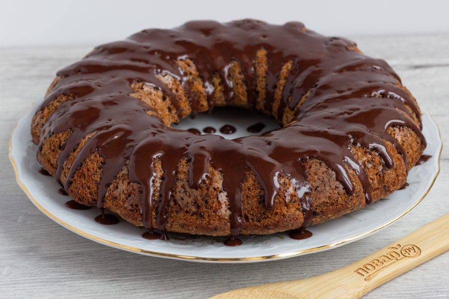Оставшийся шоколад разломайте на кусочки, добавьте растительное масло и по одной столовой ложке вливайте молоко. Держите на водяной бане и постоянно помешивайте. Когда будет нужная однородная масса, полейте кекс с помощью чайной ложки. Когда глазурь застынет, можно подавать к столу.