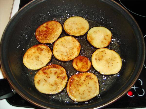 4. На отдельной сковороде в растительном масле обжарить баклажаны с двух сторон до румяной корочки.