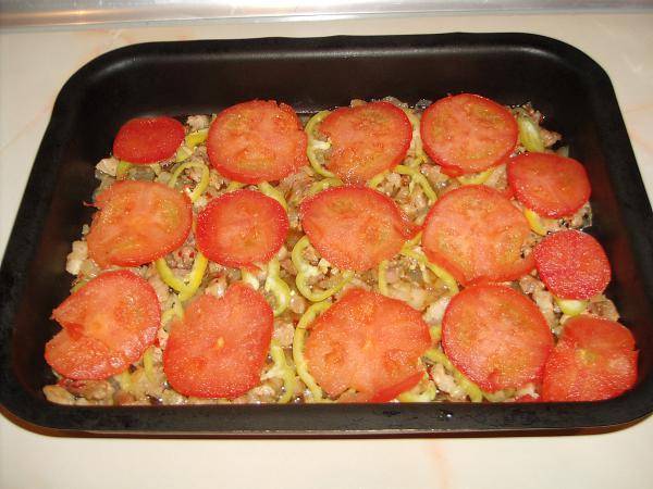 7. Помидоры вымыть и нарезать кружочками. Посолить по вкусу и отправить в форму.
