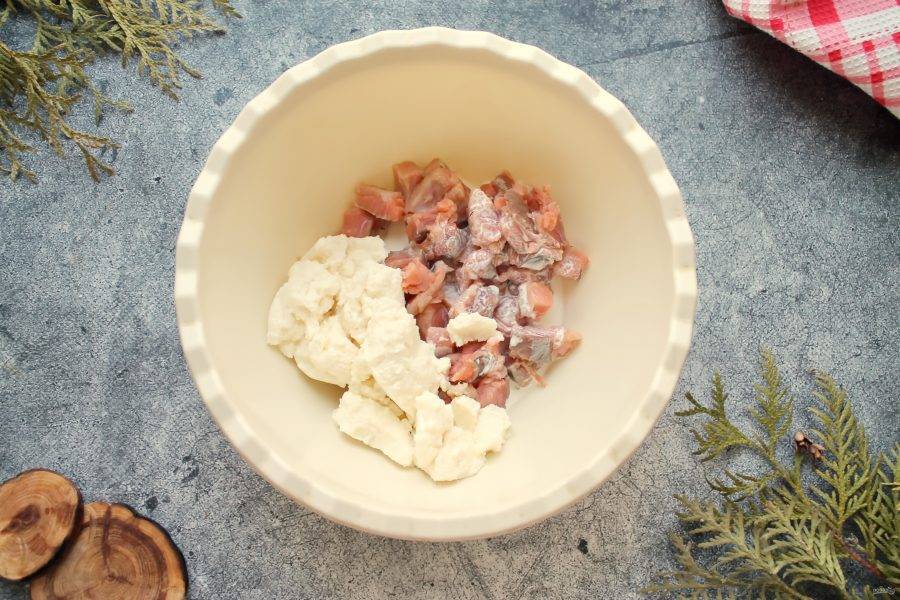Из горбуши удалите все косточки и кожу, порежьте на кусочки и выложите в миску. Добавьте к рыбе творожный сыр, сливки и лимонный сок. Пробейте все до однородного состояния.