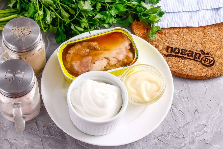 Выложите сметану любой жирности и майонез в чашу блендера, посолите и поперчите.