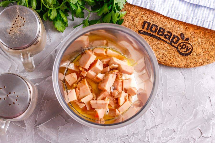 Всыпьте загуститель для сливок, если сметана магазинная, иначе мусс получится очень жидким. Нарежьте печень трески и добавьте в емкость с небольшой порцией масла.