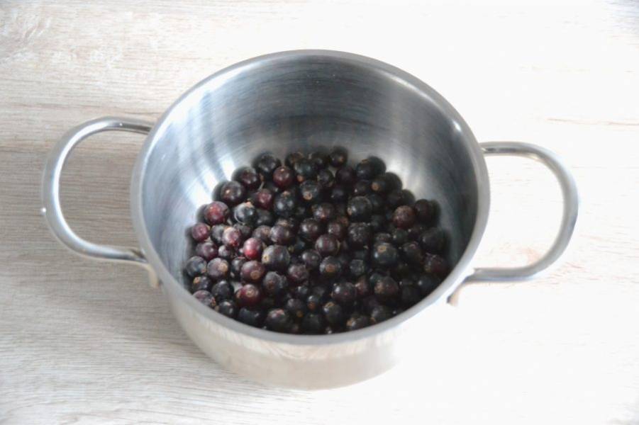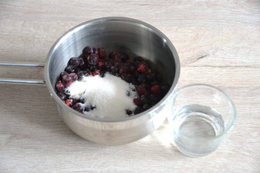 Всыпьте смородину в сотейник, добавьте 50 мл. воды и 100 грамм сахара, нагрейте.