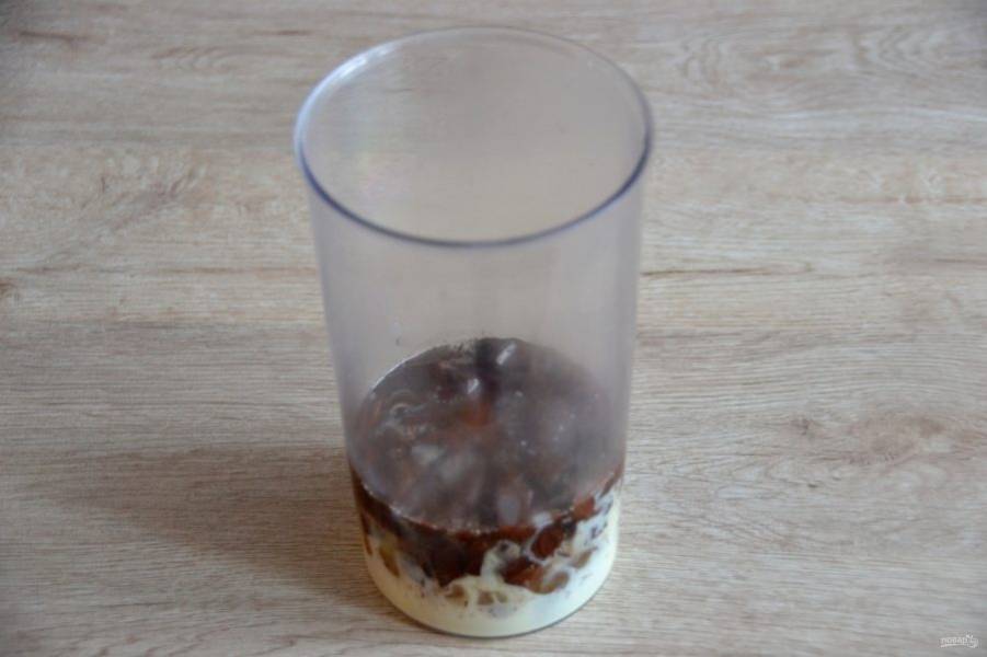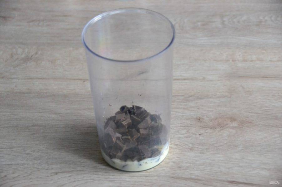 В высокий стакан влейте 50 грамм сгущенного молока, добавьте 75 грамм измельченного темного шоколада.