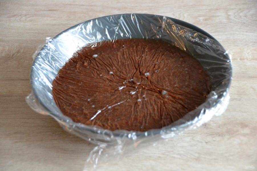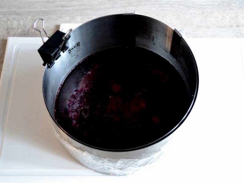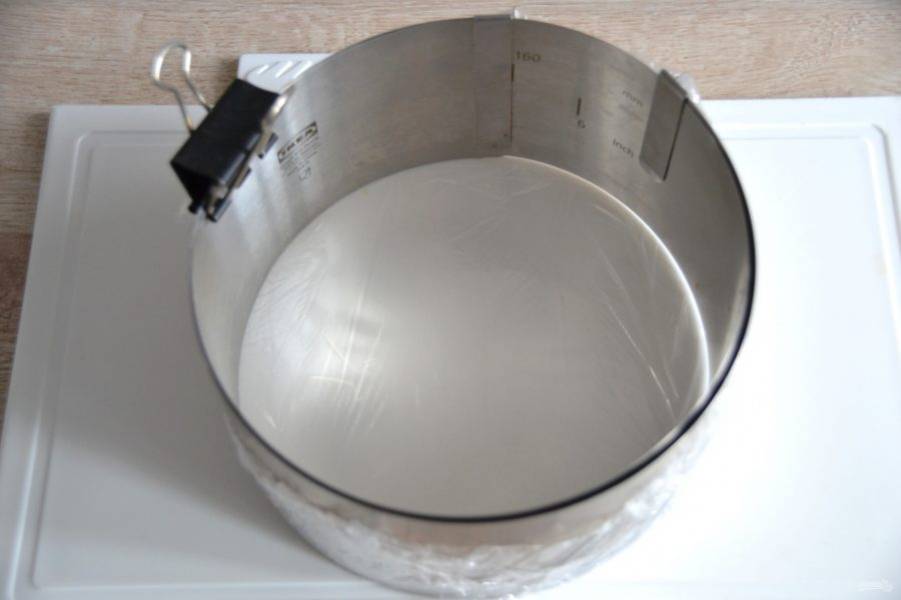 Установите кондитерское кольцо на диаметр 16 см., затяните дно пищевой пленкой, установите на твердую поверхность.