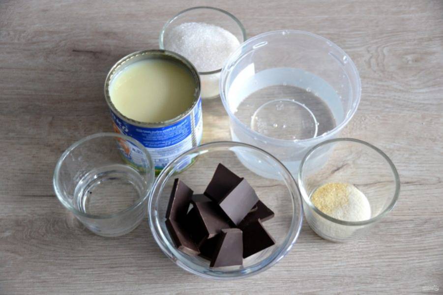 Приготовьте ингредиенты для зеркальной глазури: 6 грамм желатина, 36 мл. воды, 50 грамм сгущенного молока, 75 грамм глюкозного сиропа, 75 грамм сахара, 75 грамм темного шоколада.