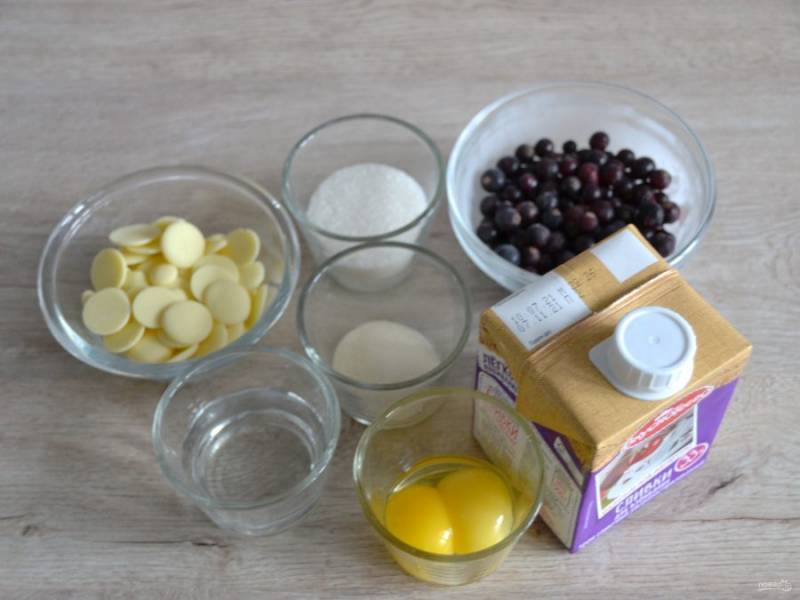 Как только застыло смородиновое конфи, можно приступить к приготовлению мусса и сборке торта. Подготовьте ингредиенты для приготовления мусса: 100 грамм смородины, 2 яичных желтка, 400 грамм сливок, 85 грамм белого шоколада, 50 грамм сахара, 10 грамм желатина, 60 мл. воды.