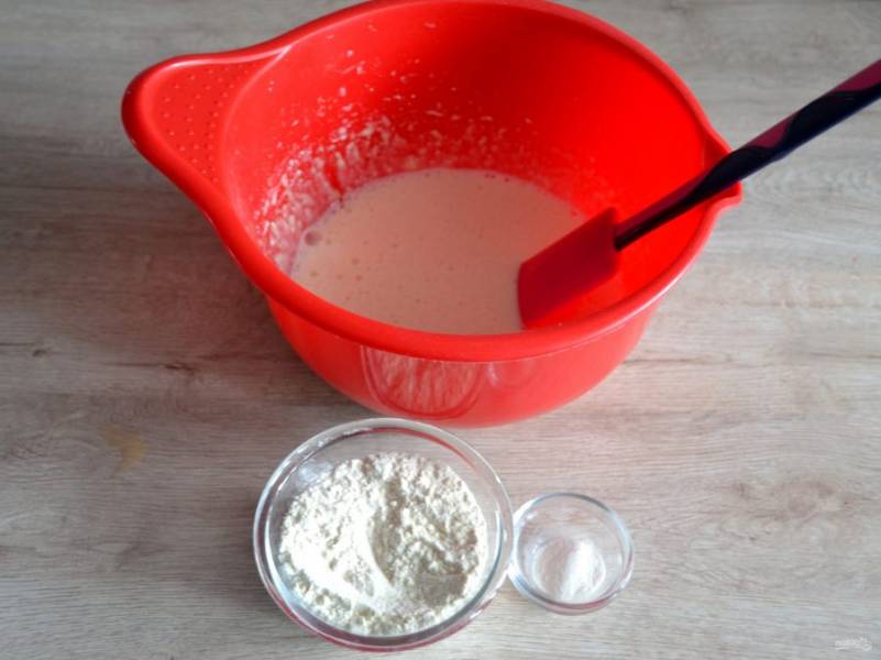 Всыпьте муку с разрыхлителем и щепоткой соли, вмешайте силиконовой лопаточкой. В 2-3 приема аккуратно вмешайте приготовленную ранее меренгу (взбитые белки).