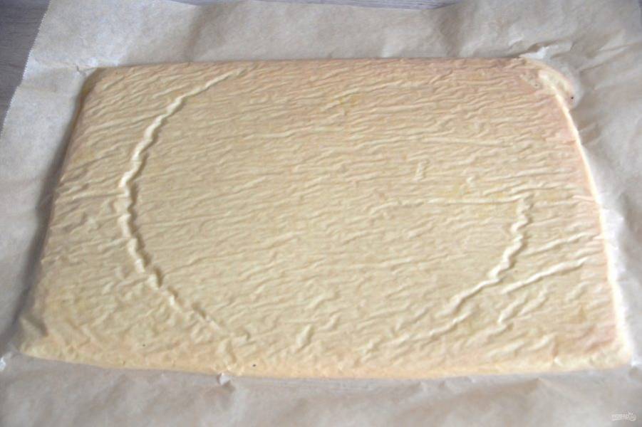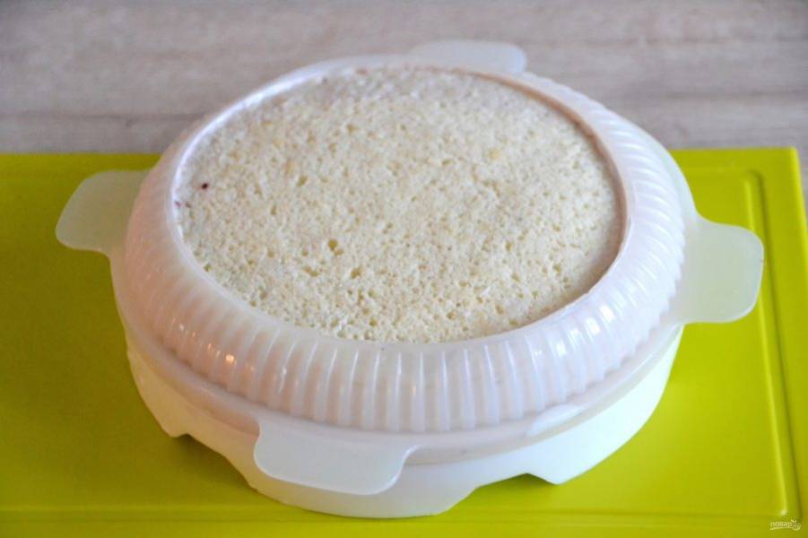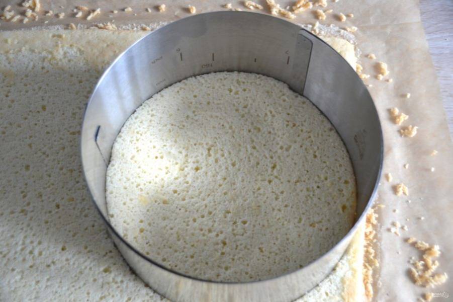 Нарежьте бисквит по нужным размерам. В данном рецепте вырежьте бисквит диаметром 16 см. Остатки бисквита можно просто нарезать на порционные кусочки или сделать заготовку для следующего торта, завернуть в пищевую пленку и убрать в холодильник, где он может храниться в течение 1 недели.
