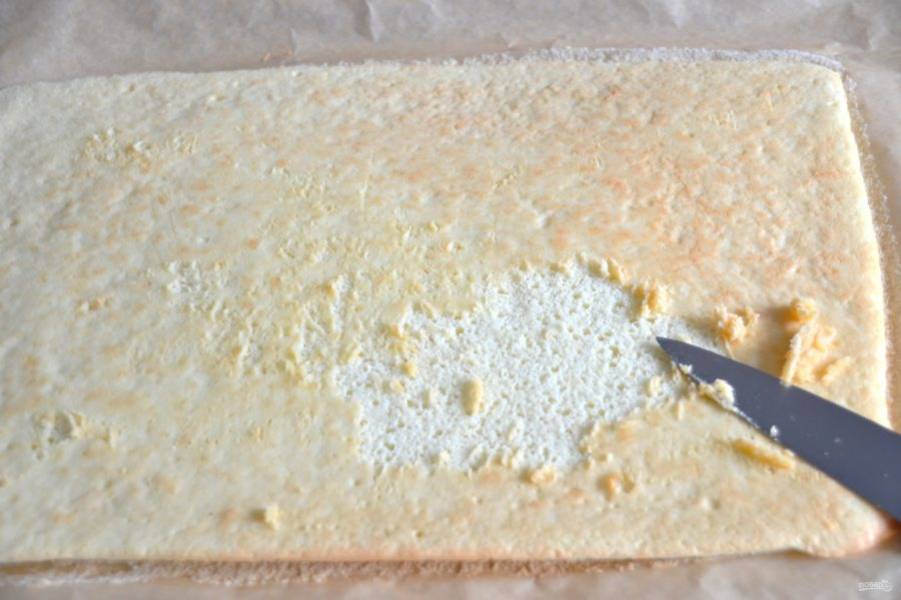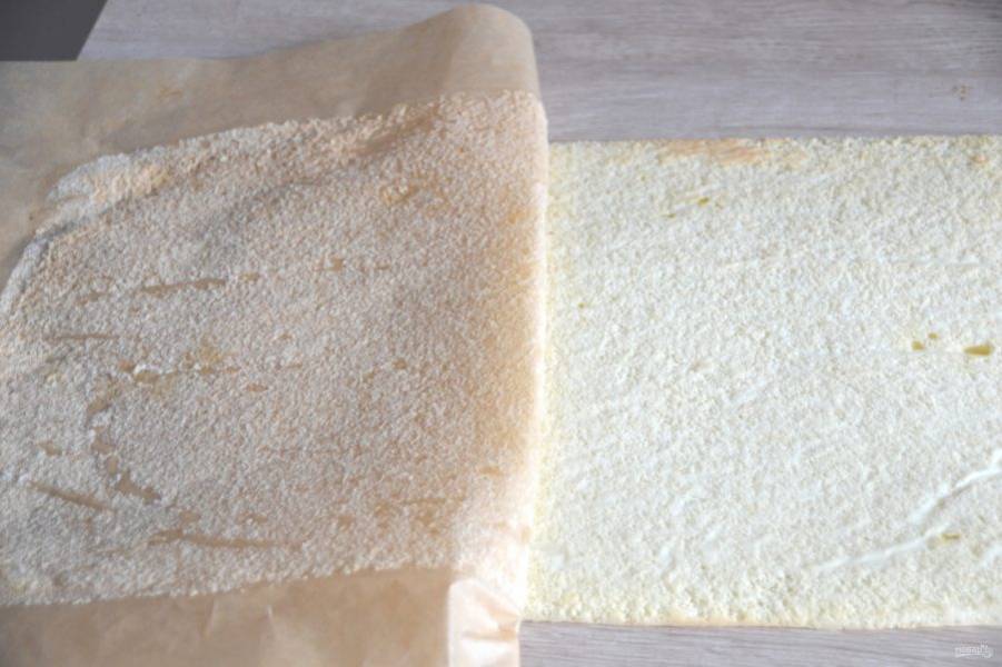 Переверните бисквит на сторону, затянутую пищевой пленкой, оставьте в таком виде на 15 минут.