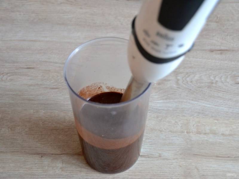 Влейте сироп в высокий стакан с шоколадом и сгущенным молоком, перемешайте. Понизьте температуру до 86 градусов, введите желатиновую массу, которую можно предварительно подогреть в микроволновой печи.