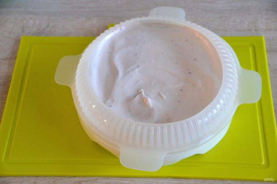 Перелейте жидкую зеркальную глазурь в миску, накройте до контакта пищевой пленкой, поставьте в холодильник для созревания на 8-12 часов.
