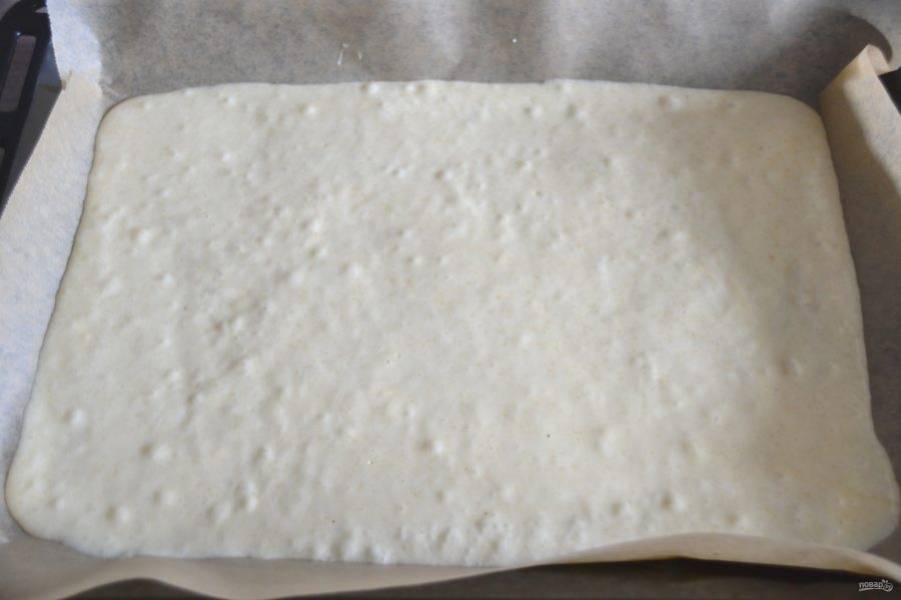 Выложите тесто на силиконовый коврик или силиконизированный пергамент (размер 30х40 см.), разровняйте.