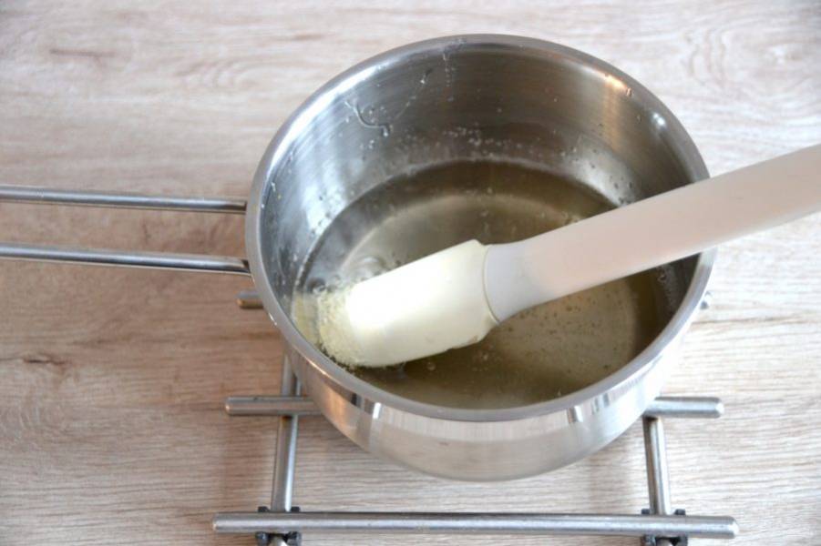В сотейник влейте 40 мл. воды, добавьте 75 грамм сахара и 75 грамм глюкозного сиропа, поставьте на средний огонь.