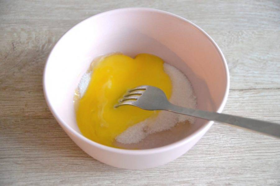 Разотрите 50 грамм сахара и 2 яичных желтка до растворения сахара.