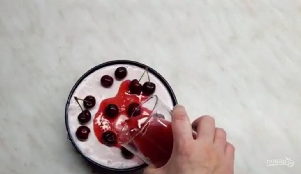 4. Соберите торт: выложите в форму бисквит, сверху выложите черешню, залейте муссом и слегка встряхните форму. Отправьте торт в морозилку на 30 минут. Приготовьте желе: желатин залейте водой и отставьте для набухания.