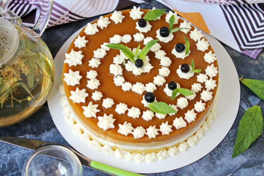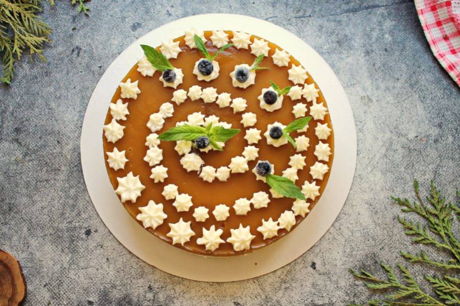 Достаньте торт из кольца, украсьте оставшимся кремом и по своему усмотрению.
