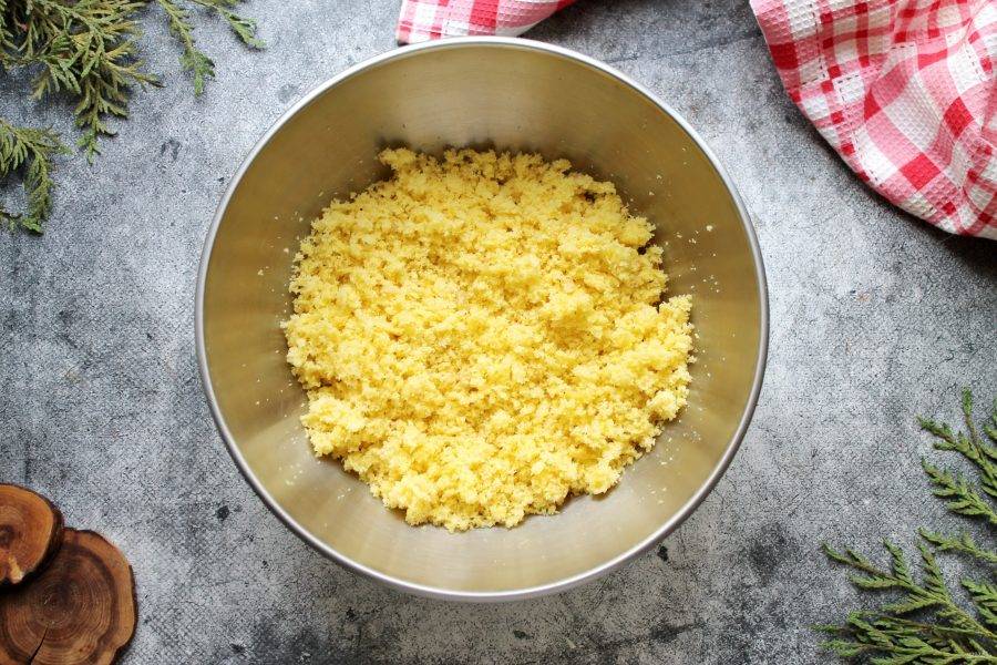 Соедините бисквитную крошку с шоколадной массой и перемешайте. В кондитерское кольцо диаметром 10 сантиметров выложите бисквитную массу и утрамбуйте. Уберите все в холодильник.