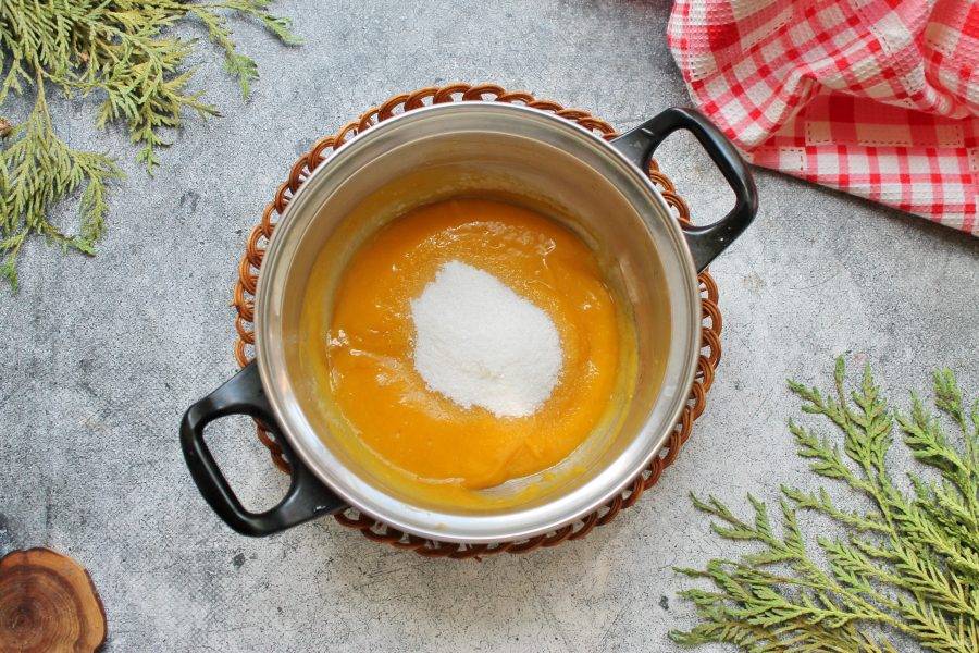 Оставшееся пюре манго нагрейте на медленном огне до первых пузырей, следя, чтобы не пригорело. Соедините сахар и крахмал, всыпьте в манго, перемешайте до однородности и, мешая, варите еще 1-2 минуты до загущения.