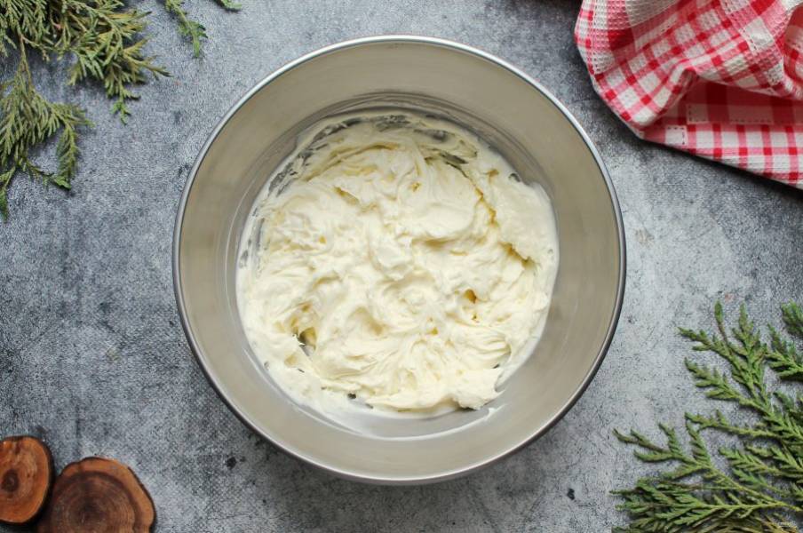 В миску выложите сливочный сыр, добавьте сахарную пудру и влейте сливки. Все взбейте в пышный крем, выложите его на бисквит ровным слоем, оставив немного для украшения.