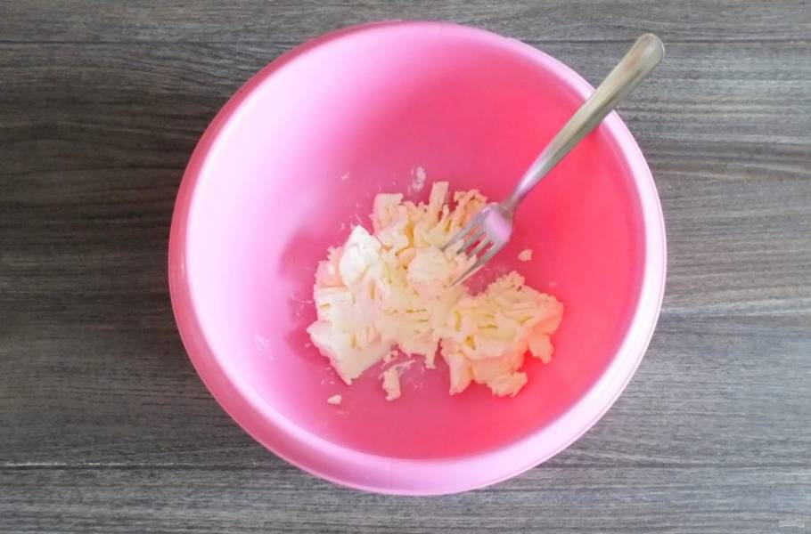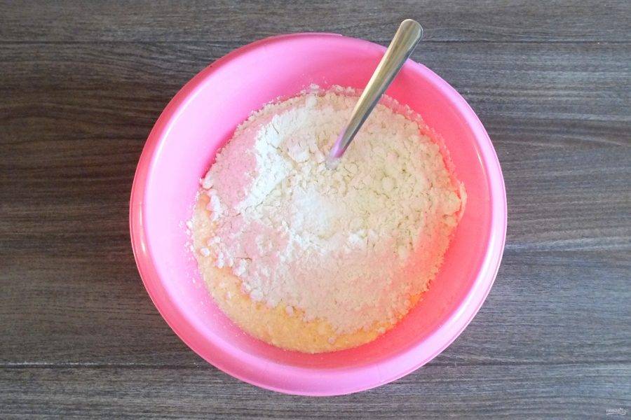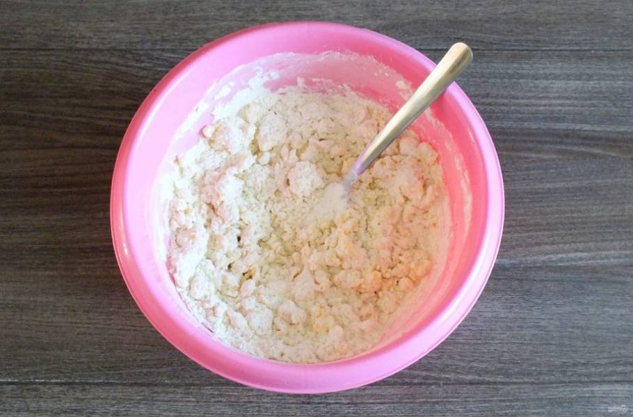 Начните тесто замешивать вилкой. Как только оно начнет собираться в комочки, месите руками.