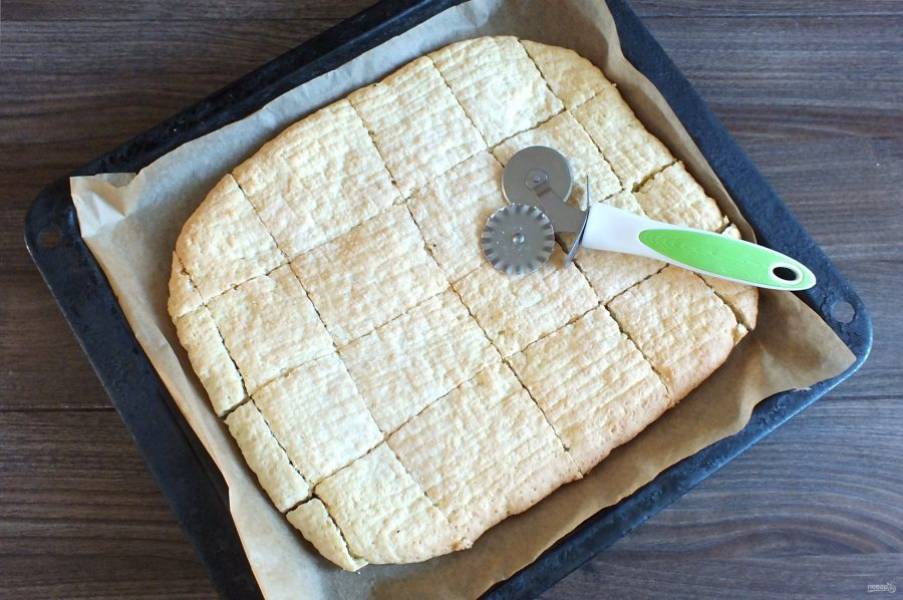 По истечении времени достаньте противень из духовки. Испеченный пласт сразу же нарежьте на квадраты или прямоугольники. Охладите на листе.