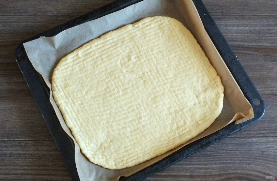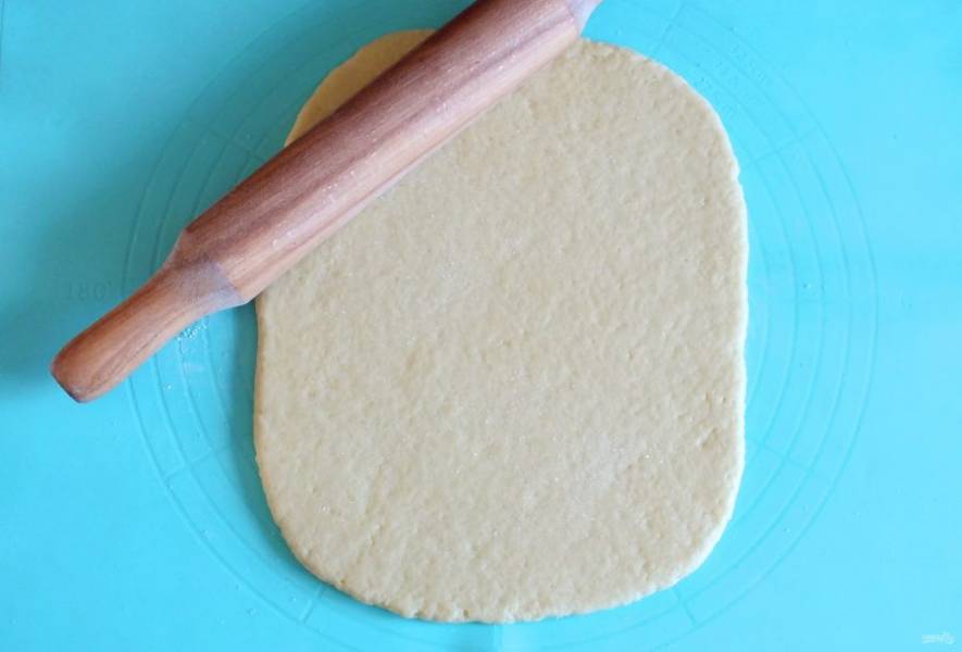 Рабочую поверхность припылите мукой. Выложите тесто. Раскатайте его в пласт толщиной 1 см.