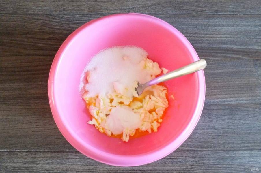 Добавьте сахар, сметану, ванилин. Перемешайте еще раз.