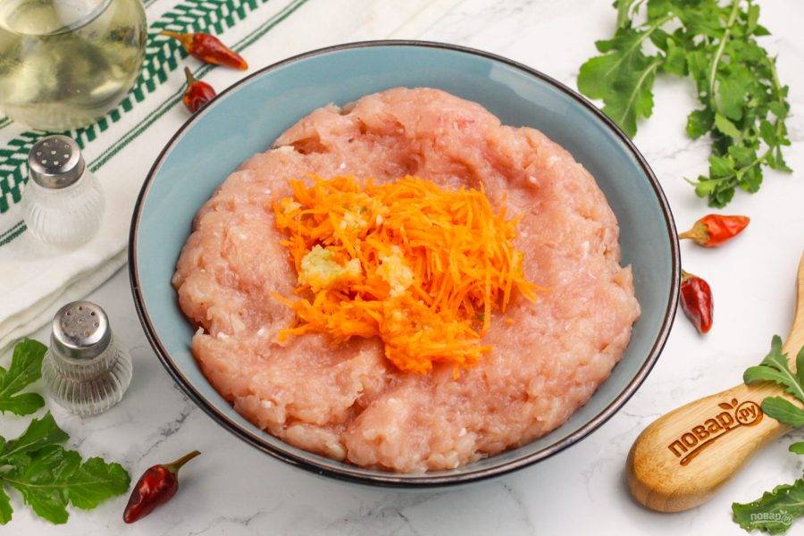 Выложите фарш в глубокую емкость: салатник, миску, пиалу. Натрите на терке с мелкими ячейками лук и морковь.