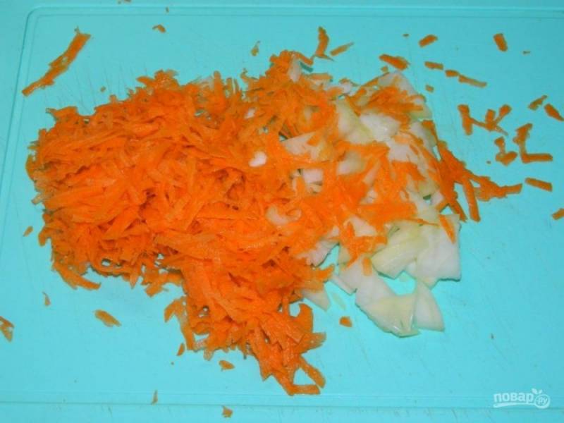 Пока мясо жарится, мелко нарежьте лук, морковь натрите на терке.