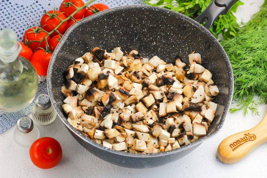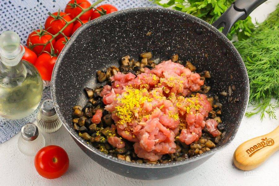 Обжаривайте грибную нарезку примерно 10 минут. Сначала она выпустит жидкость, ее необходимо будет выпарить и лишь затем грибы начнут обжариваться. Когда они приобретут коричневый цвет, можно добавлять фарш.