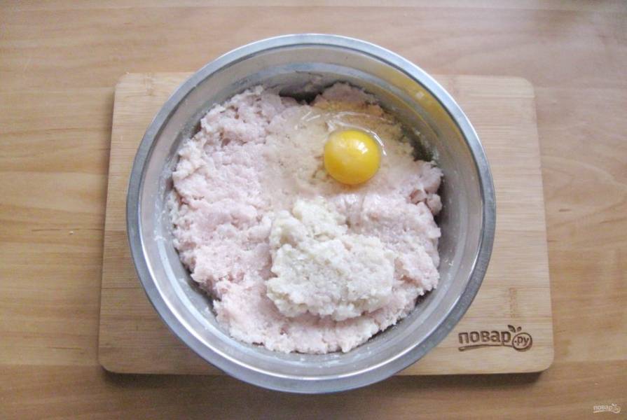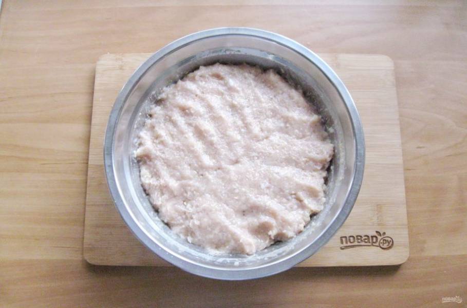 Куриное филе помойте и пропустите через мясорубку или возьмите готовый куриный фарш.