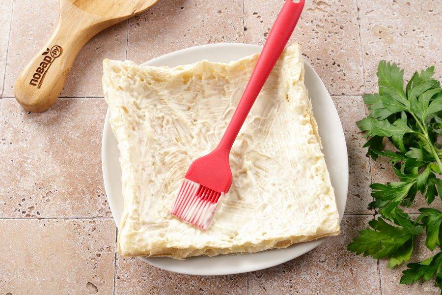 Готовый корж из слоёного теста выложите на тарелку. Смажьте майонезом.