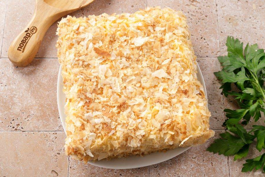 Если закусочный торт будете обсыпать крошкой, то смажьте майонезом бока со всех сторон. Я использовала для декора крошку от коржей, но можно просто подать его как есть или украсить зеленью.